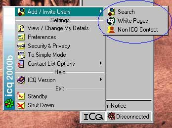 всего 3 строки: Find User -> Add To List, ICQ White Pages, Add Non ICQ